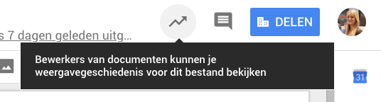 Het activiteitendashboard vind je terug in Google Documenten, Spreadsheets en Presentaties. Sinds kort is deze ook beschikbaar voor G Suite Basic gebruikers en is hij meer in het zicht geplaatst. Het dashboard kun je openen door op het pijltje te klikken die naast de opmerkingen en delen optie staat.