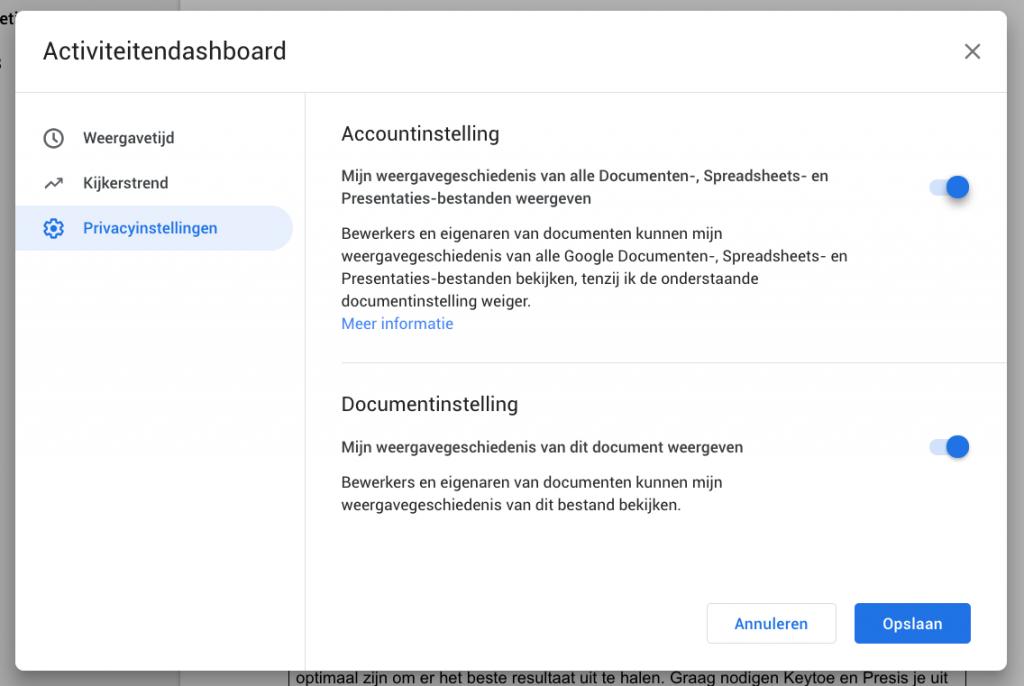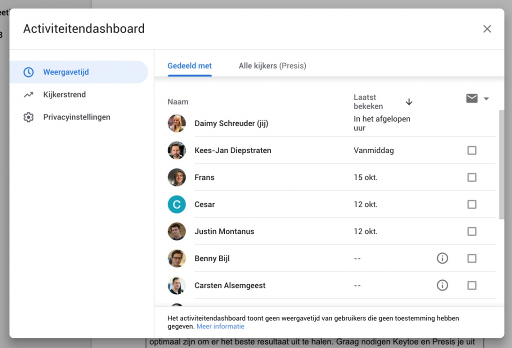 - Als beheerder kun je bepalen of gebruikers kunnen inzien of het bestand bekeken wordt of niet.
