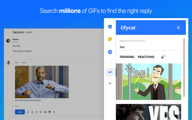 Met de nieuwe Gmail heb je snel toegang tot apps die je vaak gebruikt, zoals Google Agenda en Keep zonder je inbox te verlaten. Ook kun je er meerdere add-ons vinden die je kunt gebruiken. Bijvoorbeeld, de meest briljante ooit: de Gyfcat-add-on. Waarom? Omdat gifjes soms het beste antwoord zijn. Best vaak eigenlijk.