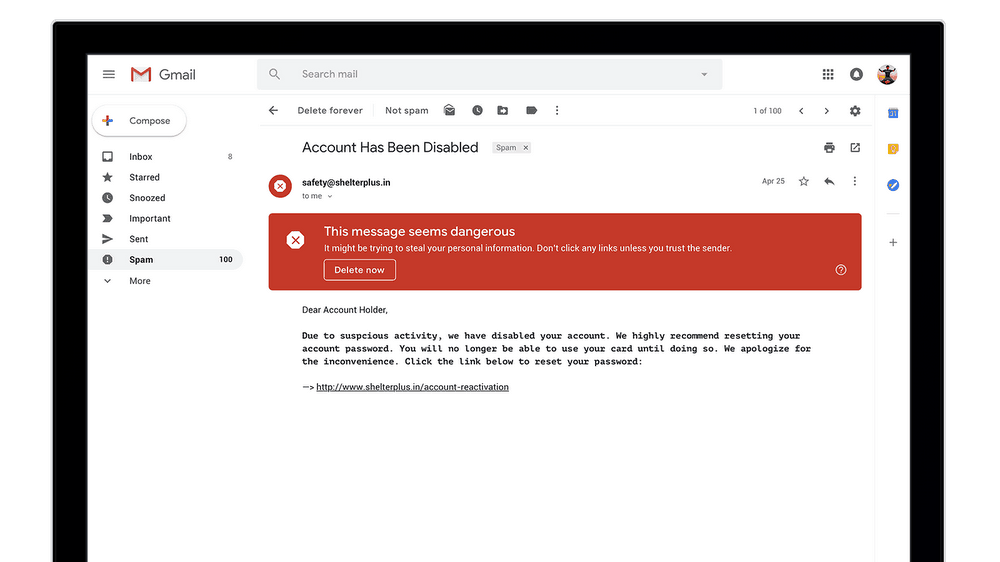 Heb je wel eens per ongeluk op een e-mail geklikt waarbij de alarmbellen gingen rinkelen? Het kan gebeuren. Gmail helpt je dit soort berichten te vermijden door je proactief te waarschuwen voor foute emails. Wanneer je erop klikt, komt er een grote, rode waarschuwing in beeld die aangeeft dat dit waarschijnlijk niet ok is.
