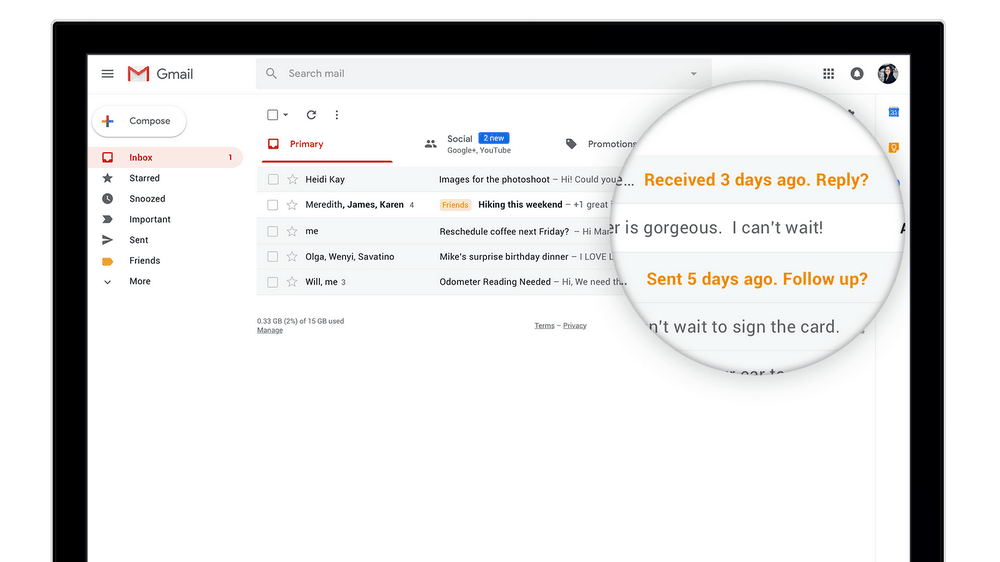 Om dit voortaan te voorkomen geeft Gmail je een subtiele herinnering. Deze staat aan het einde van de e-mail in je inbox, in een opvallender kleurtje. Hierdoor weet je hoelang de zender al wacht op een antwoord. Door de machine learning die Google gebruikt is deze feature slim, waardoor bepaalde afzenders (waar je bijvoorbeeld vaker contact mee hebt) een hogere prioriteit krijgen dan anderen.