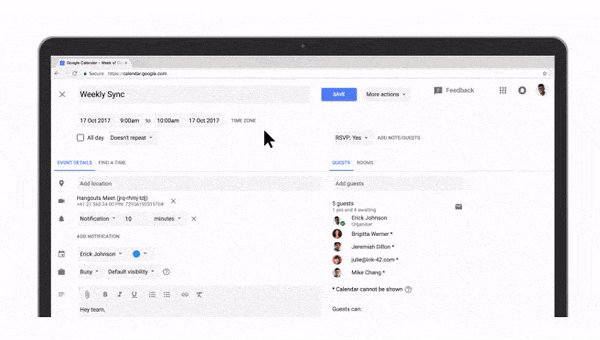 - Voeg een opmaak en hyperlinks toe aan je Agenda uitnodiging. Voortaan kun je doorverwijzen naar een Spreadsheet, Document of Presentatie in de uitnodiging die je verstuurd met Agenda. Ontvangers kunnen deze link direct openen vanuit de ‘Evenement details’. Dankzij deze functie kun je voortaan meer gedetailleerde afspraken maken met alle relevante informatie in één overzicht.