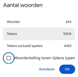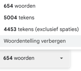 Tip: wil je weten hoeveel woorden en tekens een bepaald stuk tekst bevat, bijvoorbeeld een hoofdstuk of een alinea? Zet dan de woordentelling aan en selecteer het stuk tekst. Google Document laat dan zien hoeveel woorden en tekens het geselecteerde stuk tekst bevat en hoeveel woorden en tekens het gehele document bevat.