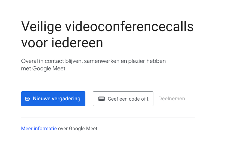 Als je de link: https://meet.google.com/aaa-bbbb-ccc naar je klant of collega stuurt (via e-mail, Whatsapp of Google Chat) dan is dat alles wat je hoeft te doen!
