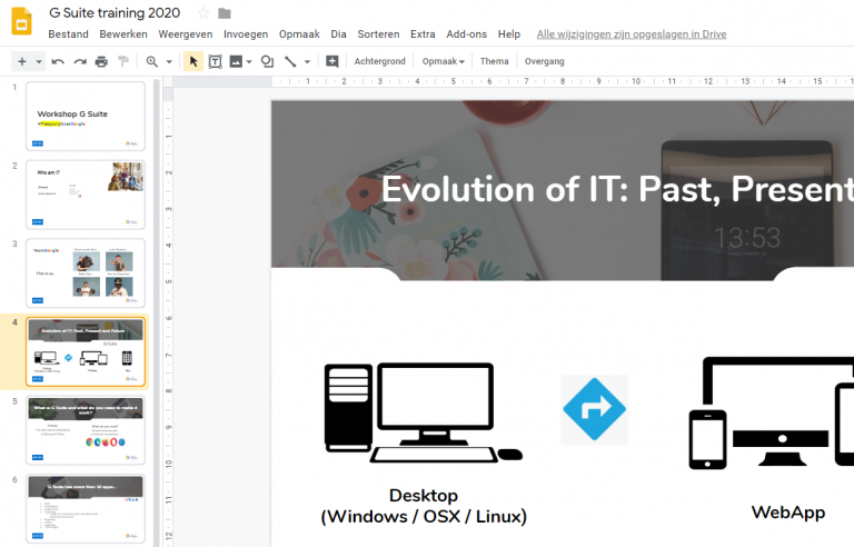 Zijn jullie Powerpoint gewend, dan komen jullie weinig verrassingen tegen. Sterker nog, jullie gaan gewoon op dezelfde snelheid verder. Een presentatie delen hoeft niet meer door het hele bestand op te sturen, maar net zoals bij o.a. Documenten kan dat via een link.